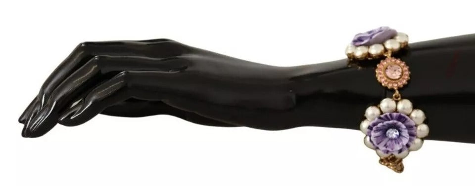 Gorgeous 100% Authentic brand new with tags DOLCE & GABBANA Bracelet with large floral decorations. The baroque model was decorated with hand-painted enamel buds. Such details successfully coexist with mother-of-pearl cabochons and sparkling crystals of different shades and sizes. The openwork accessory is made of golden hypoallergenic brass, which will not fade for a long time.